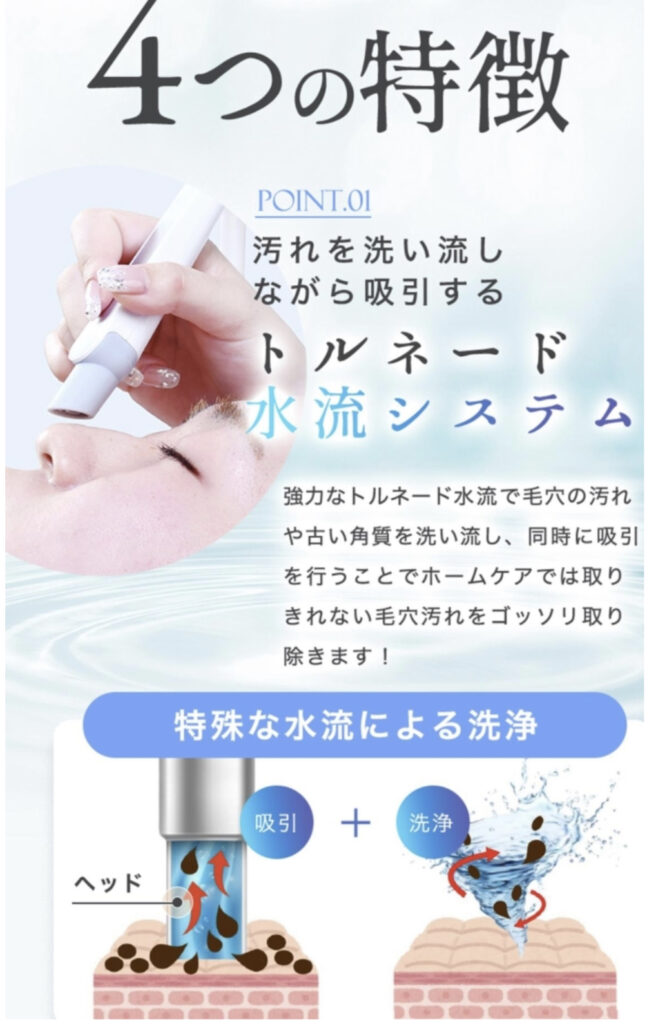 - 特殊な水流による洗浄(吸引+洗浄): 画像の下部にあるイラストでも示されているように、ヘッドから噴出される水流がらせん状のトルネードを形成し、肌表面だけでなく毛穴の壁面にも作用します。これにより、毛穴の奥の汚れを掻き出し、同時に強力な吸引で瞬時に除去する、まさに画期的な仕組みです。